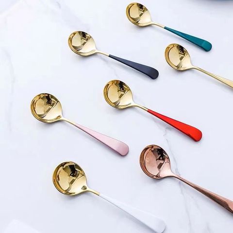 Haute qualité réutilisable 304 18/8 acier inoxydable or rond servant une cuillère à soupe table à manger cuillère à café ensemble avec poignée colorée